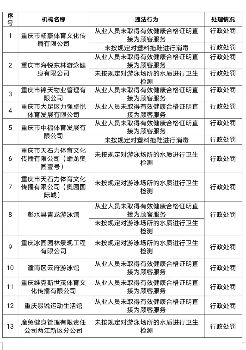 接下來,相關區縣衛生和體育部門將及時跟進32家存在問題的游泳場所整改落實情況,確保相關問題得到整改解決,并對重慶市海悅東林游泳健身有限公司、重慶市暢豪體育文化傳播有限公司、重慶維克斯世茂體育文化傳播有限公司、重慶易銳運動生活館等13家存在違法違規行為的游泳場所進行行政處罰,切實讓群眾安“夏”心、“游”放心。