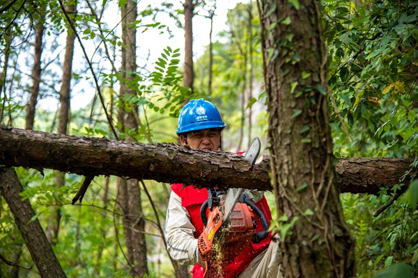 “一、二、三,拉!” 8月23日上午10時,重慶城口縣和平社區杜家溝內,隨著“轟隆”一聲,國家電網紅巖(城口)共產黨員服務隊清理了一棵影響線路運行的大樹。