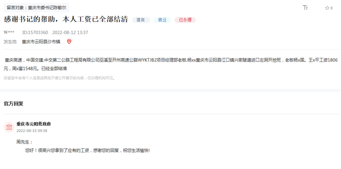 重慶市云陽縣政府回復稱:很高興你拿到了您應得的工資,感謝您的來信回復,祝您生活愉快!