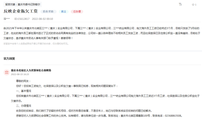 一位網友留言:“自2022年下半年以來重慶市北碚區一公司,拖欠海外員工工資已近3個月,目前只發放了5月份的工資,而且社保醫保以及住房公積金一直沒有繳納,目前處于欠繳狀態,懇求重慶市勞動人事有關部門給予重視!”