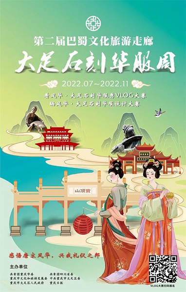 為深學篤用習近平新時代中國特色社會主義思想,助力成渝地區雙城經濟圈建設,引導廣大青年在實踐中弘揚中華優秀傳統文化,堅定文化自信,厚植愛國情懷,共青團重慶市委、共青團四川省委、重慶市文化和旅游發展委、中共重慶市大足區委、重慶市大足區人民政府、重慶日報決定聯合舉辦“第二屆巴蜀文化旅游走廊—大足石刻華服周”活動,活動持續至2022年11月15日。