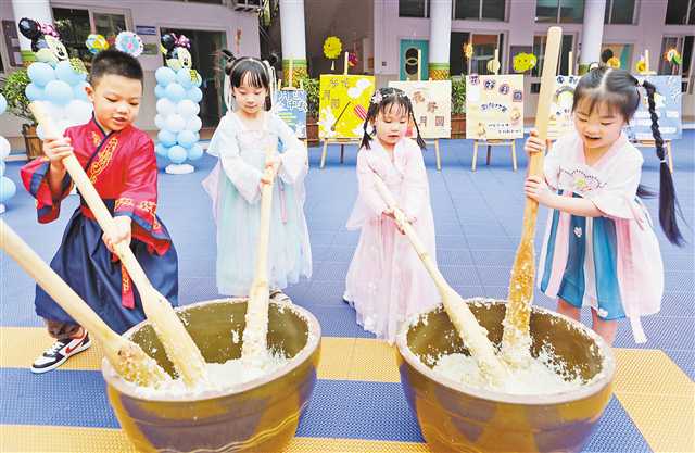 9月8日,大足區東城幼兒園,小朋友正在體驗打糍粑。當日,該園舉行“我們的節日·中秋”主題活動,小朋友們通過打糍粑、著漢服、繪制花燈等方式,感受傳統民俗文化,喜迎中秋佳節。特約攝影 瞿波/視覺重慶