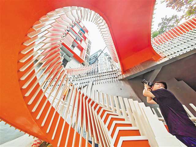 9月17日,南岸區龍門浩街道龍門路,市民正在旋轉樓梯拍照留影。