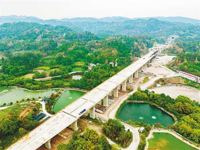 9月20日,位于巴南區惠民街道的渝湘高鐵重慶至黔江段石家沖四變二特大橋建設現場。