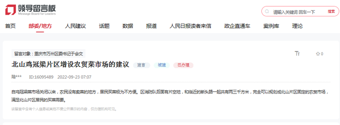 人民網重慶10月2日電 (陳琦)“自雞冠梁菜市場關閉以來,農民沒有賣菜的地方,居民買菜極為不方便?!苯?,有網友通過人民網“領導留言板”給萬州區委書記于會文留言,建議在附近增設農貿市場。