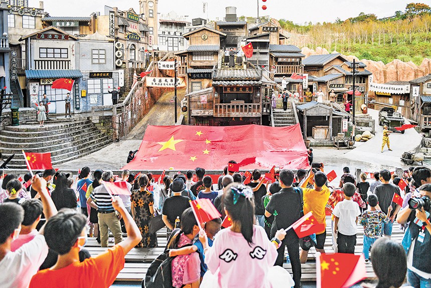 10月1日,天氣晴好,不少市民帶著家人來到重慶歡樂谷游玩、看劇,度過開心假日。圖為游客在老重慶景區觀看影視特效劇《山城風云》后揮舞國旗齊聲高唱《我和我的祖國》。記者 齊嵐森 攝/視覺重慶