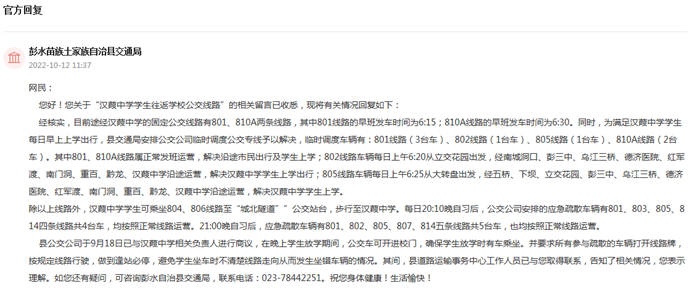 留言后,彭水苗族土家族自治縣交通局馬上核實情況,并與彭水漢葭中學相關負責人進行商議,在晚上學生放學期間,公交車可開進校門,確保學生放學時有車乘坐。