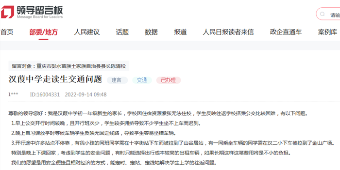 該家長在留言中稱,學校因住宿資源緊張無法住校,孩子在往返學校搭乘公交的過程中,主要有幾個問題:早上因公交車班次少,學生較多導致不少學生坐不上車而遲到。其次,晚自習放學時,學生反映無固定線路,導致學生容易坐錯車輛。