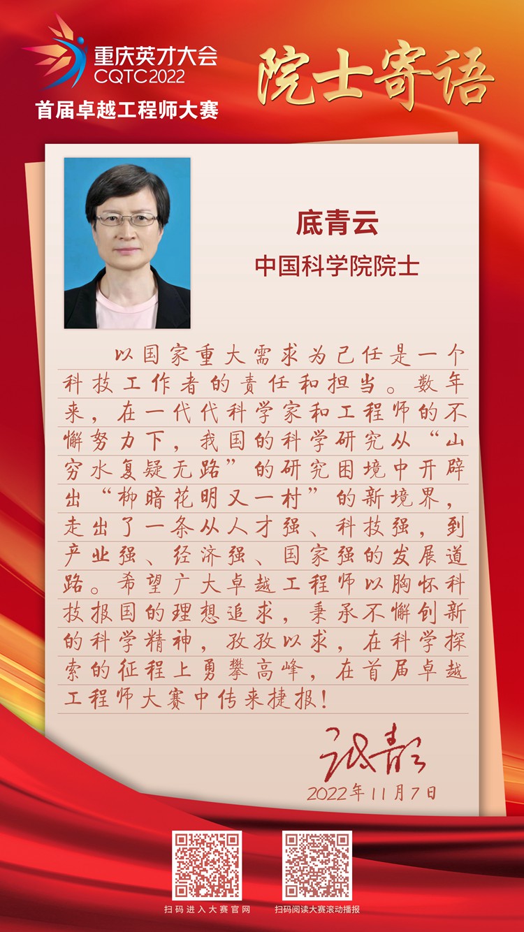 11月7日,中國科學院院士底青云向2022重慶英才大會首屆卓越工程師大賽發來寄語:以國家重大需求為己任是一個科技工作者的責任和擔當。數年來,在一代代科學家和工程師的不懈努力下,我國的科學研究從“山窮水復疑無路”的研究困境中開辟出 “柳暗花明又一村”的新境界,走出了一條從人才強、科技強,到產業強、經濟強、國家強的發展道路。希望廣大卓越工程師以胸懷科技報國的理想追求,秉承不懈創新的科學精神,孜孜以求,在科學探索的征程上勇攀高峰,在首屆卓越工程師大賽中傳來捷報!