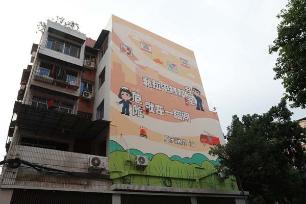目前,重慶市大足區已完成文昌路、青年路兩處消防彩繪墻。鮮明的消防安全提示標語、與生活密切相關的消防知識、生動形象的消防漫畫……形成了一道靚麗的風景線。彩繪墻不僅扮靚了環境,也成為廣大群眾學習消防安全知識的“流動課堂”。