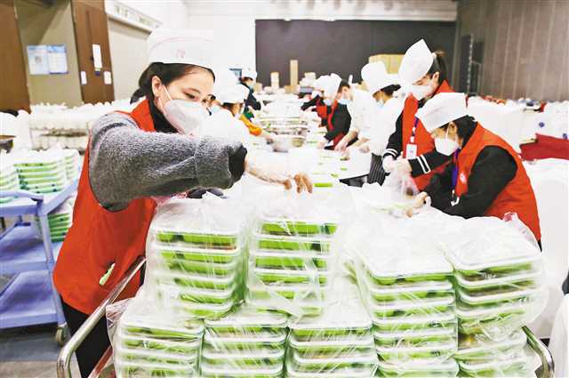 11月19日,墊江縣商務委青年先鋒保供隊在定點供餐酒店協助備餐。自本輪疫情發生以來,該縣商務委第一時間組建了青年先鋒保供隊,活躍在物資供應、物流配送等各條戰線,聚焦保障“最后一米”,確保物資運輸渠道、集中隔離點物資配送等暢通。 特約攝影 向曉秋/視覺重慶