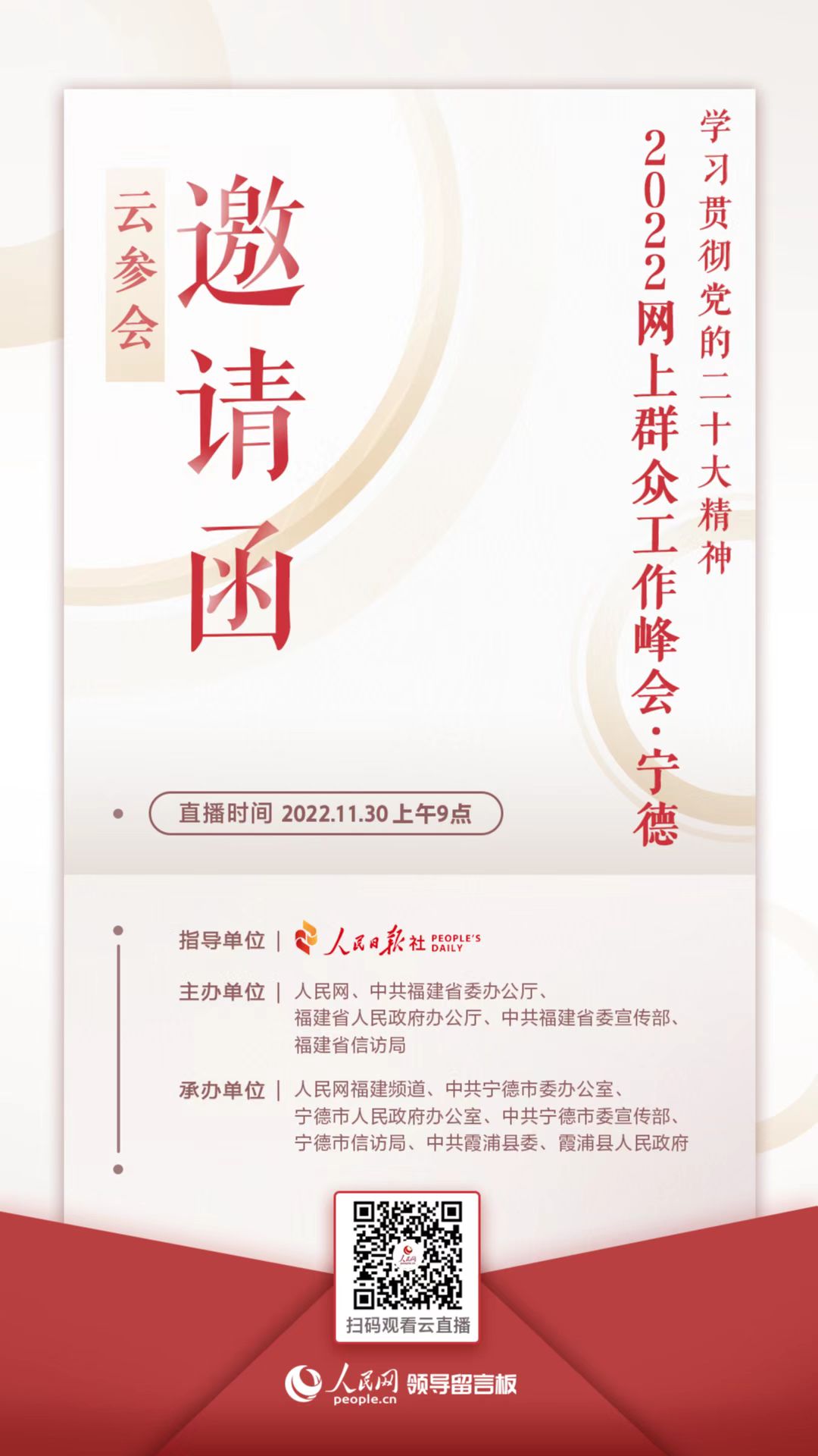 人民網北京11月23日電(記者 曾帆)為深入學習貫徹黨的二十大精神,由人民日報社指導,人民網、中共福建省委辦公廳、福建省人民政府辦公廳、中共福建省委宣傳部、福建省信訪局主辦的2022網上群眾工作峰會將于11月30日在福建省寧德市舉行。