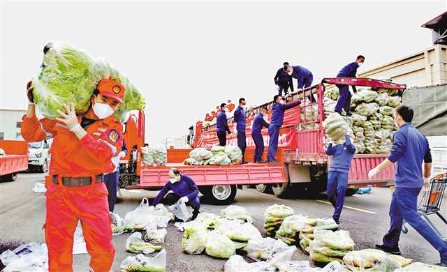 11月24日,墊江縣中農聯渝東國際農貿城,縣應急救援支隊和消防隊隊員正在分裝蔬菜。