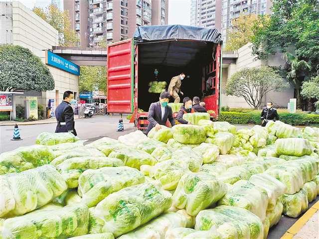 26日下午,各社區正抓緊送菜。江北區石馬河街道通用社區黨委書記任家誼介紹,轄區有4800戶常住居民,他們動員100多名社區工作人員、物業人員、志愿者給每戶送一顆大白菜,根據防控要求,或到小區、或到樓棟大廳、或到戶。此外,對于困難家庭、獨居老人等,街道還額外配送含三線肉、排骨和西紅柿、胡蘿卜等在內的愛心包。