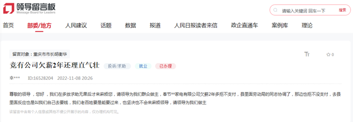 人民網重慶12月5日電 (陳琦)“想人民之所想,行人民之所囑,萬分感激勞動局和人民網平臺的同志幫我解決了困擾2年多的欠薪難題?!苯?,重慶奉節縣一網友在人民網“領導留言板”上給重慶市市長胡衡華留言表達感謝。