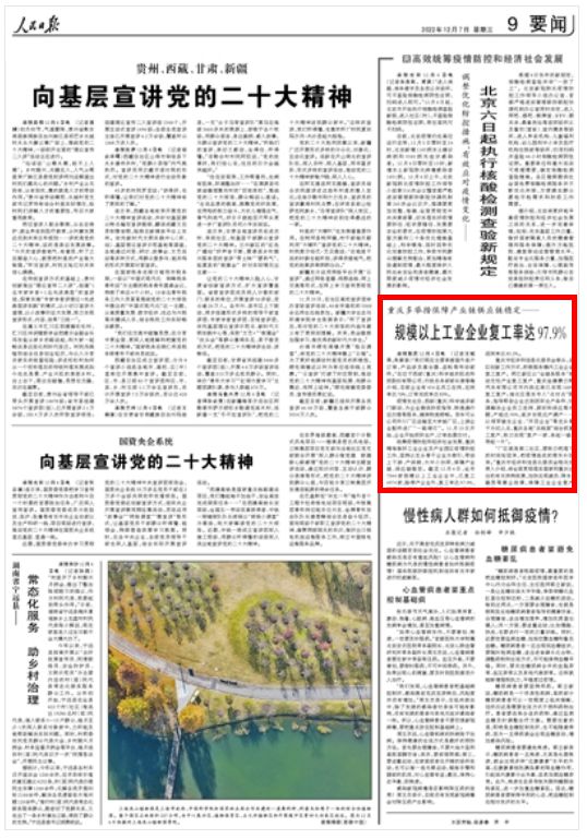 統籌疫情防控和經濟社會發展,重慶精準做好工業企業及產業園區疫情防控工作,堅持以龍頭骨干企業為牽引,帶動上下游、產供銷、大中小協同,保障產業鏈、供應鏈穩定。截至12月4日,全市7346家規模以上工業企業中,已復工6974家,除停產企業外,復工率達97.9%,規模以上工業企業返崗員工126.6萬人,返崗率達85.2%。