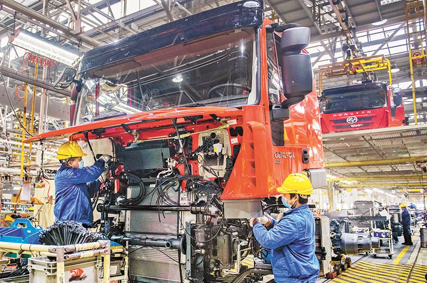 12月16日,上汽紅巖汽車有限公司,工人正在總裝車間作業。
