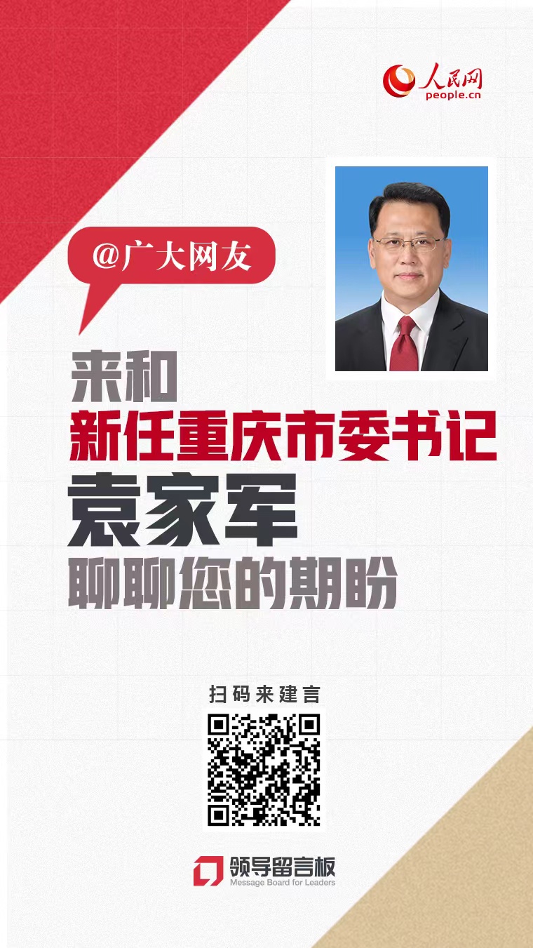 日前,中共中央決定:袁家軍同志兼任重慶市委委員、常委、書記。任命消息發布后,就有群眾在人民網“領導留言板”給袁家軍書記留言,反映自己的所思所盼,也為重慶未來發展建言獻策。
