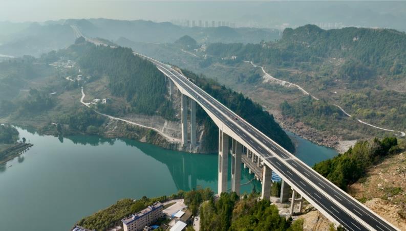 項目建設條件復雜,連續跨越多條鐵路,項目控制性工程沿溪溝特大橋為渝東南地區已建橋梁中最高的多孔連續剛構橋,橋梁全長799米,主跨跨越G319國道及沿溪河谷,最高落差達185.4米,最高墩墩身高度140.6米,技術難度大、安全風險高。建設過程中,中國鐵建施工團隊通過技術攻關,成功解決了高墩空心墩橫隔板施工難題,獲得“橋梁空心墩橫隔板無支撐體系快速施工關鍵技術”等工法及實用新型專利4項、“提高超高墩混凝土施工質量”等市級質量控制成果2項。