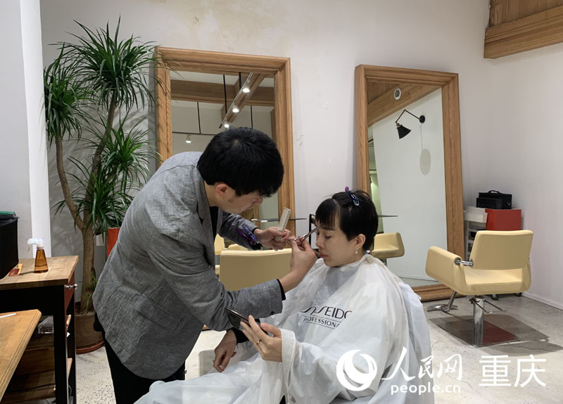 發型師小龍為顧客做造型。人民網 陳琦攝