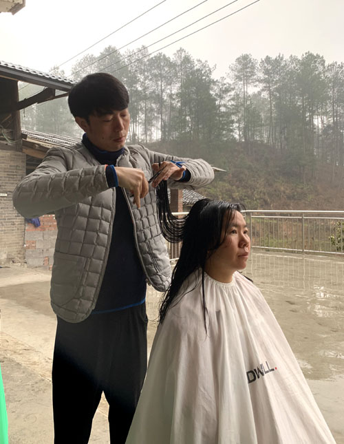 春節期間,小龍回老家義務為鄉鄰理發。受訪者供圖