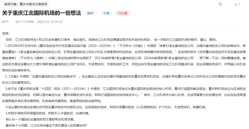 原來,李先生于今年1月在重慶江北國際機場通航33周年來臨之際,結合江北機場運營建設現狀和重慶市政府的規劃 ,通過“領導留言板”提出了自己對江北國際機場在六個方面的疑問、建議和期待。以下為留言簡要: