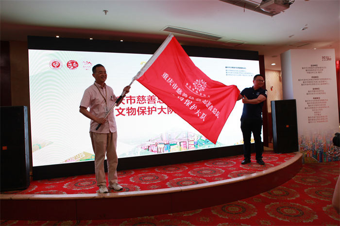 活動現場,慈善總隊對文物保護志愿者總隊進行了授旗。文物保護志愿者總隊對四川美術學院、重慶大學兩個實習基地授牌,并為評選出的2022年優秀團隊和個人,頒發榮譽證書和獎品。