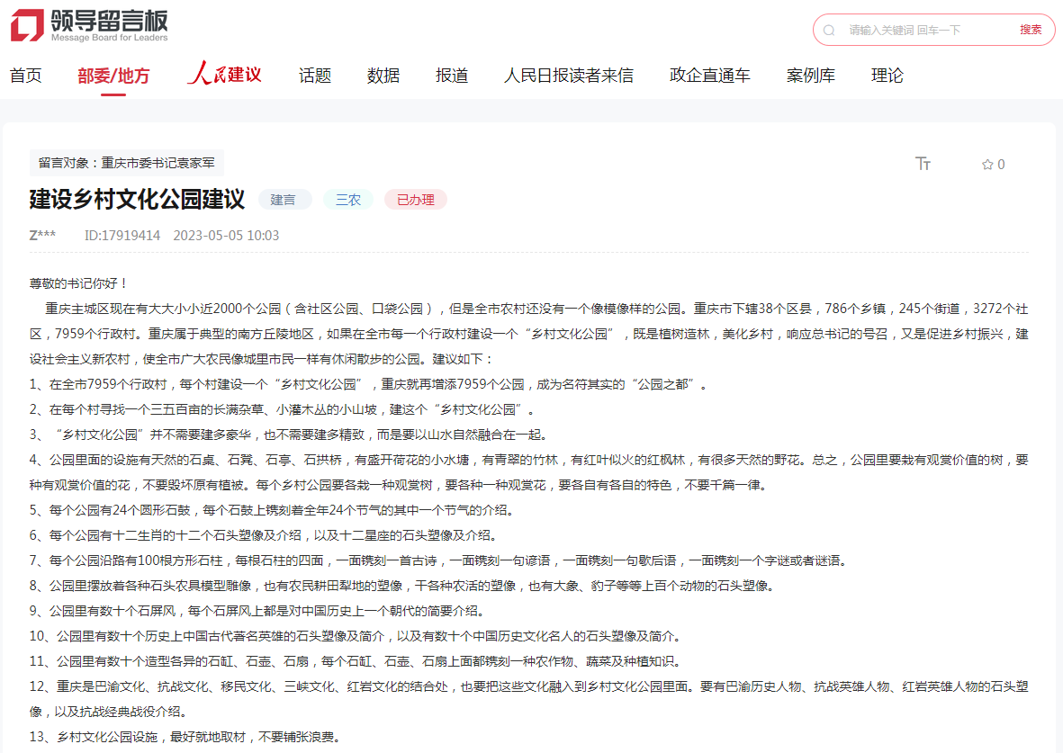 網民程先生在留言中提了13條詳細建議:重慶主城區現在有大大小小近2000個公園(含社區公園、口袋公園),但是全市農村還沒有一個像模像樣的公園。重慶屬于典型的南方丘陵地區,建議在全市7959個行政村,每個村建設一個“鄉村文化公園”,重慶就再增添7959個公園,成為名符其實的“公園之都”。