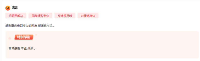 “非常感謝,問題已得到解決,回復很細致專業!”得到留言答復后,該網友通過人民網“領導留言板”評價,回復群眾問題,內容詳實周全,并對重慶市政府口岸物流辦的同志表示感謝。