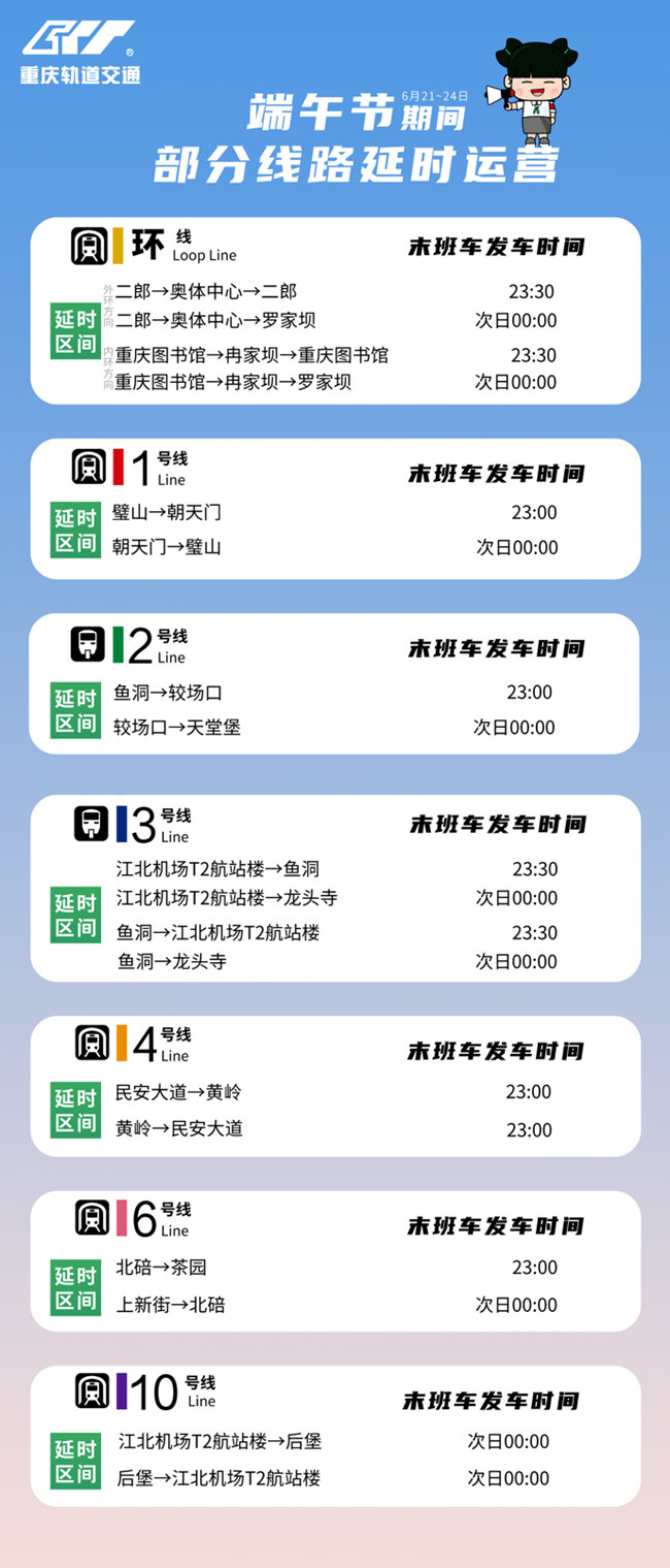 來自重慶交通開投軌道集團消息,6月21日至6月24日,軌道交通1號線、2號線、3號線、4號線、6號線、10號線、環線將延長運營時間。