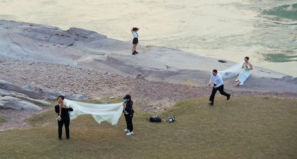秋高氣爽,江邊拍婚紗照的情侶很多。陳啟寧攝
