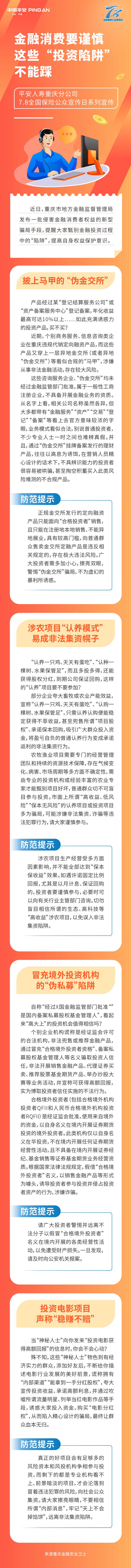 近日,平安人壽重慶分公司響應國家金融監督管理總局和中國保險行業協會號召,落實重慶銀保監局、重慶市保險行業協會工作部署,開展“7.8全國保險公眾宣傳日”系列活動,特別推出金融知識分享。本期分享主題為:《金融消費要謹慎,這些“投資陷阱”不能踩》。(平安人壽重慶分公司)