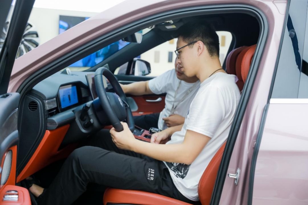 在華為智能生活館內,智選車引人注目。車機聯動,智慧出行,手機就是“車鑰匙”,不僅能一鍵開車門,還能一鍵開空調,調節車內溫度。上車后,車機屏無縫托管手機屏,可繼續手機上打電話、聽音樂的操作。