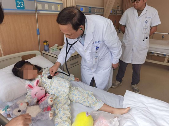 鐘前進為即將出院的欣欣再次檢查心臟。重慶康心醫院供圖