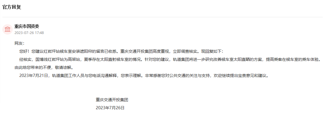 很快,重慶交通開投集團調查核實后,進行了回復。經核實,國博線紅巖坪站為高架站,夏季存在太陽直射候車室的情況。針對您的建議,軌道集團將進一步研究改善候車室太陽直曬的方案,提高乘客在候車室的乘車體驗。