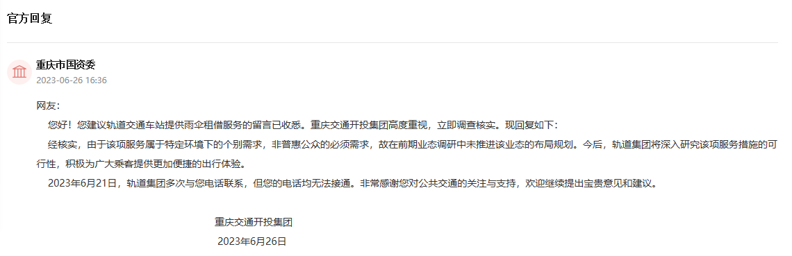 “最近在重慶旅游,天公不作美,下雨了,但發現重慶軌道交通車站目前沒有雨傘租借服務?!毕奶焯鞖鈵灍?,經常會下雨。近日,有網友留言建議軌道交通在雨天能夠為乘客提供雨傘租借服務。