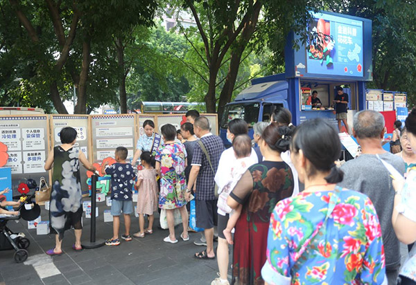 “嘞是個啥子車喲,還有點乖喃,走過去看下?!痹缟?點,看見花花車停穩后,不少剛買完菜的市民便停下腳步,打量著這輛正在“變身”的花車。免費理發、免費拍照、免費套圈、免費飲料和小零食……隨著花花車的科普場景一一展示,市民們也恍然大悟:“原來是金融知識學習,怕我們上當受騙?!?/p>
