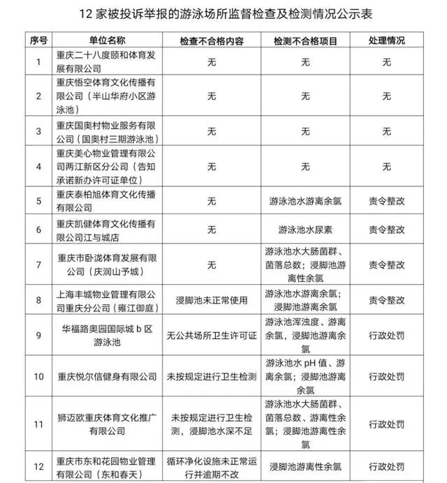 目前,這12家被舉報投訴的游泳場所的監督檢查及檢測結果已出爐。其中合格4家,不合格單位8家。對不合格的8家單位,相關衛生健康和體育部門已責令整改,并對華福路奧園國際城b區游泳池、重慶悅爾信健身有限公司、獅邁歐重慶體育文化推廣有限公司、重慶市東和花園物業管理有限公司(東和春天)等4家存在違法行為的單位進行立案查處。