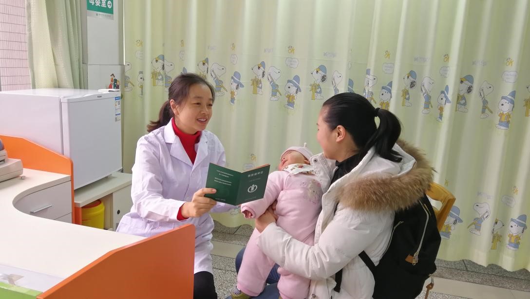 何繼菲(左一)為患者講解疫苗接種的注意事項