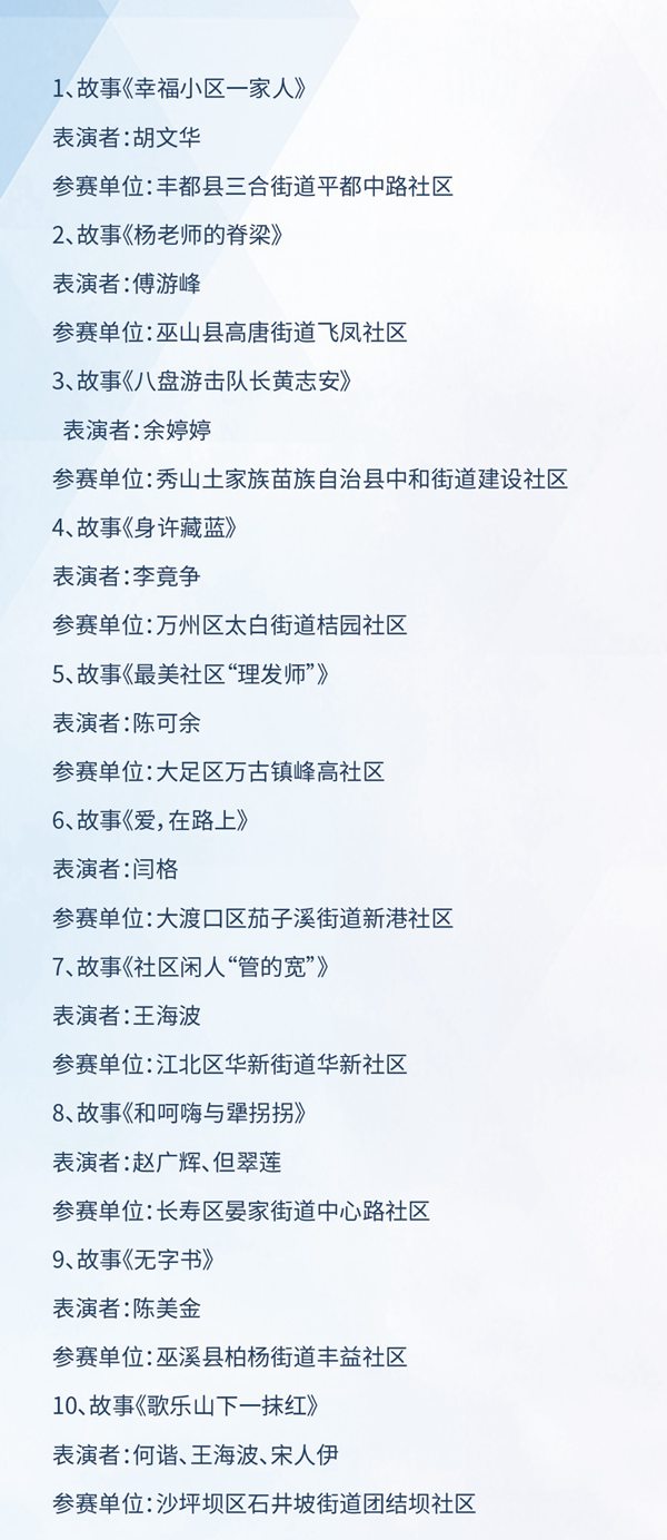 第七屆重慶市社區藝術節社區故事會市級集中展示還設置了和諧作品、和美作品與和睦作品三個等級的獎項。當天,國家公共文化云、重慶群眾文化云和全國22家省級文化云等網絡平臺以及中國廣電重慶公司公共文化平臺巴渝文旅云電視大屏,將同步現場進行網絡直播和宣傳推廣。還可關注“重慶市群眾藝術館”微信公眾號,觀看本屆社區藝術節社區故事會市級集中展示直播視頻。(張艷)