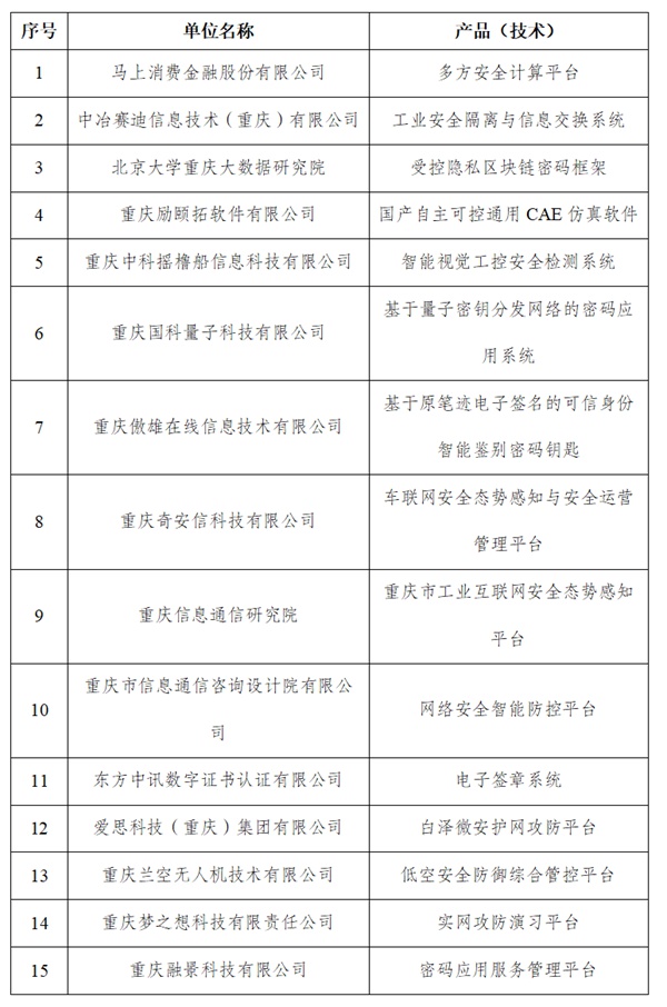 在重慶市委網信辦、市經濟信息委聯合組織下,網絡安全產品和技術征集推薦活動在全市范圍內開展。經過自主申報、專家推薦、公示等環節,啟動儀式現場公布了包括馬上消費金融股份有限公司的多方安全計算平臺、中冶賽迪信息技術(重慶)有限公司的工業安全隔離與信息交換系統在內的15項網絡安全產品和技術。