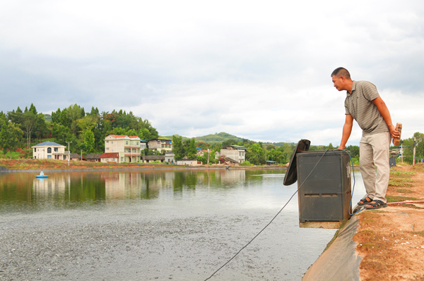 在潼南區塘壩鎮石花村,一片連著一片的魚塘碧波蕩漾,金秋時節格外美麗。今年36歲的裴森在自家門口的魚塘里,用智能投料機投撒魚食,平靜的水面立刻被打破,傳來唧唧的聲響,許多魚苗探出了頭,爭先恐后地搶食。