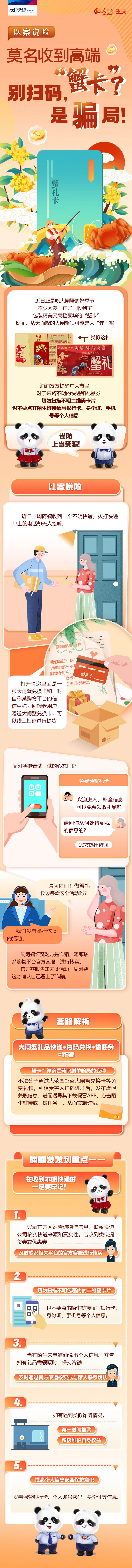 近日正是吃大閘蟹的季節,不少市民“正好”收到了包裝精美又高檔豪華的“蟹卡”。然而,從天而降的大閘蟹很可能是大“詐”蟹,浦發銀行重慶分行提醒廣大市民,對于來路不明的快遞和禮品券,切勿掃描不明二維碼卡片,也不要點開陌生鏈接填寫銀行卡、身份證、手機號等個人信息,謹防上當受騙。(李金)