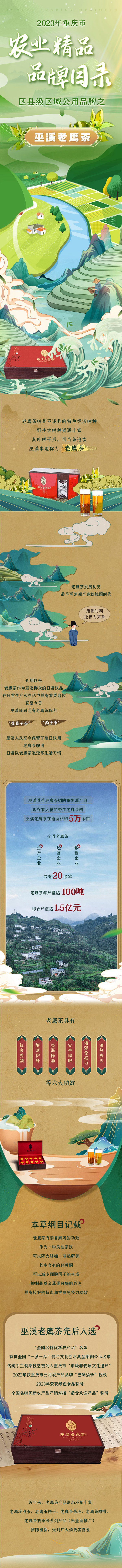 近日,重慶市農業農村委發布《2023重慶農業精品品牌目錄》(以下簡稱《目錄》),經過資格審核、專家評審等評選環節,共有64個品牌入選。本次發布的《目錄》包含“巴味渝珍”“三峽柑橘”兩個重慶市級區域公用品牌,萬州玫瑰香橙、涪陵榨菜、趕水草蔸蘿卜、放牛坪梨等28個區縣級區域公用品牌,樹上鮮花椒油、魚泉榨菜、井谷元重慶二兩小面、陳昌銀麻花等34個企業產品品牌,集中呈現了重慶市農業品牌建設的豐碩成果。本文將帶你詳細了解入選《目錄》區縣級區域公用品牌的巫溪老鷹茶。