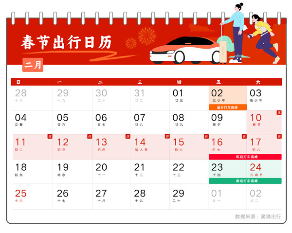 滴滴預測2024年春運出行高峰日歷。滴滴供圖