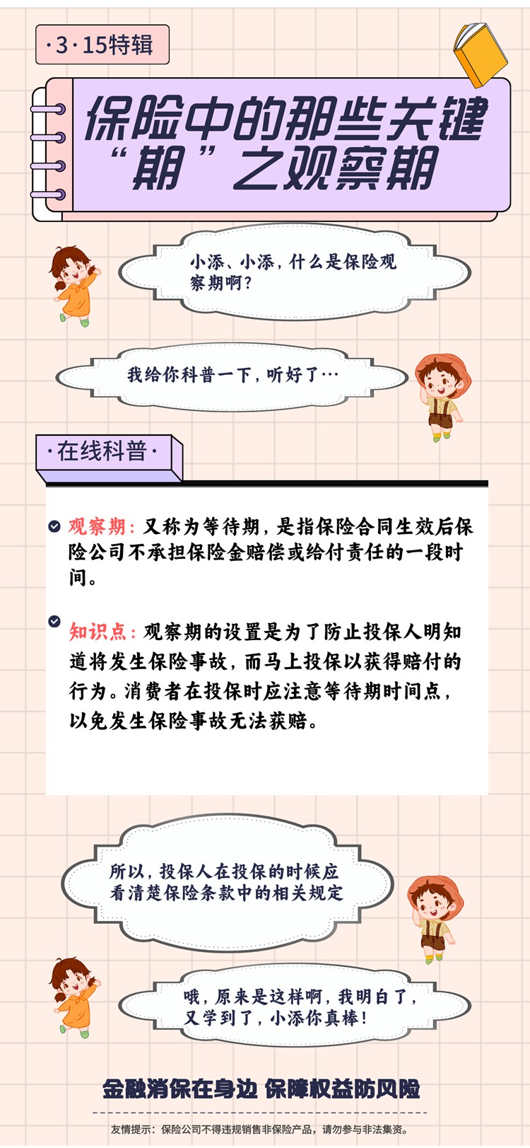 3月4日—3月15日,國家金融監督管理總局重慶監管局開展以“金融消保在身邊 保障權益防風險”為主題的2024年重慶“3·15”金融消費者權益保護教育宣傳周活動。為做好金融消保知識宣傳教育,切實提升群眾金融素養和風險防范意識,平安人壽重慶分公司積極響應監管部署,推出金融消保課堂系列分享。本期分享主題為:《保險中的那些關鍵“期”之觀察期》。(平安人壽重慶分公司)