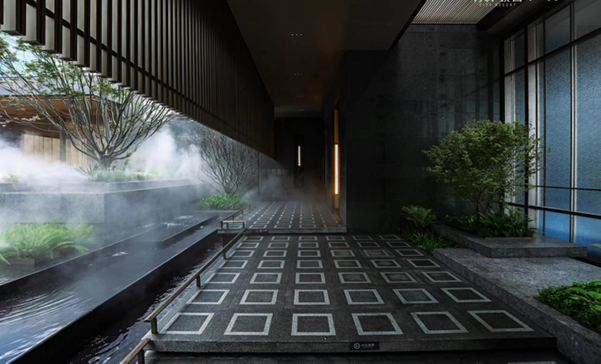 項目負責人介紹,萬科璞園·璞玉入戶空間整體挑高約4.8米,吊燈、吧臺、墻面、壁燈等設計融合了傳統文化元素;下沉庭院,結合建筑空間,用漸變玻璃磚打造了約7.5米的飛瀑。