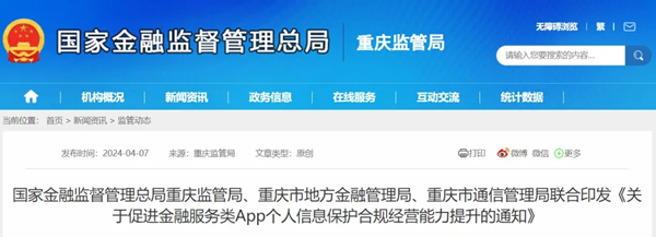 近日,國家金融監督管理總局重慶監管局、重慶市地方金融管理局、重慶市通信管理局三部門聯合印發《關于促進金融服務類App個人信息保護合規經營能力提升的通知》(以下簡稱《通知》),建立聯合監管工作機制,并基于現行法律法規,結合金融行業特點梳理完成《重慶市金融服務類移動互聯網應用程序個人信息保護合規指南(V1.0)》,對轄內銀行保險機構、地方金融組織、相關App運營者進行合規指導。