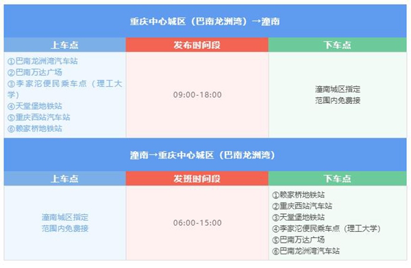 該線路在重慶中心城區多點約客上(下)車,途經巴南萬達商圈、多個地鐵站等,在潼南指定范圍內免費接送,其詳情如下: