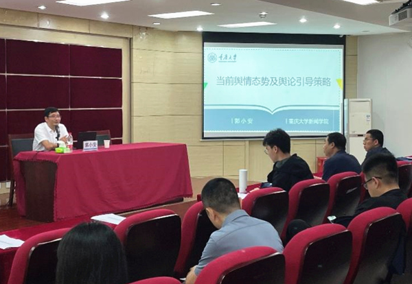 輿情信息與危機管理課程負責人、重慶大學新聞學院院長郭小安以“當前輿情態勢與輿論引導策略”為題,圍繞“輿論場的十個關鍵詞”“網絡熱點事件的五個炒作節點”“突發事件的輿情應對”“突發事件的新聞發布”等內容進行講授,并對新聞模擬發布注意事項作了交代。